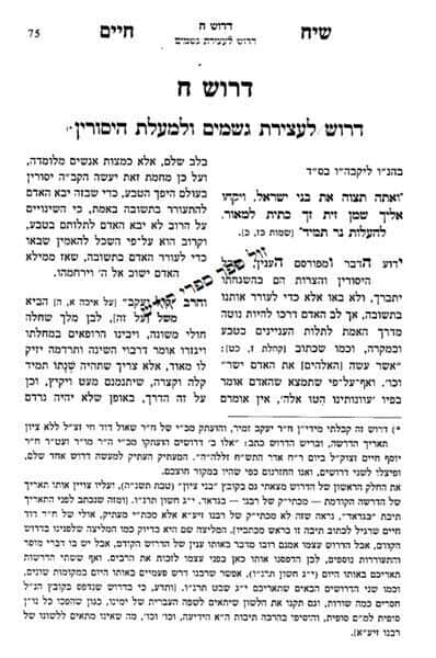 שיח חיים - דרושים לעצירת גשמים, על יסורין וחולאים רעים, למגיפה, ומיתת הילדים, ודרשה להכנסת ספר תורה וסיום מסכתא, ובמעלת הצדקה ובמעלת ארץ ישראל.