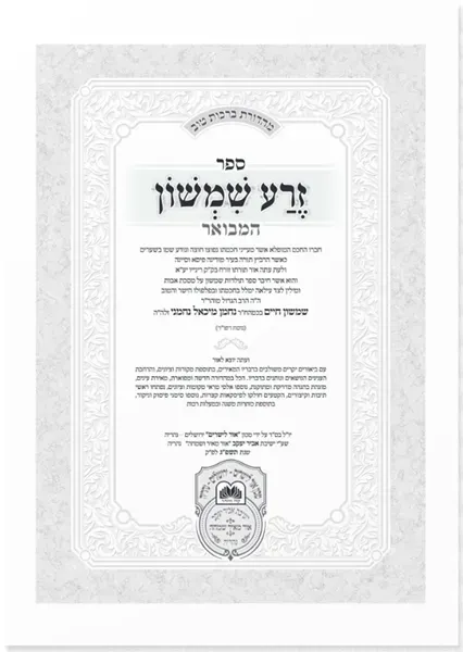 ספר זרע שמשון על התורה מאת הגאון הקדוש רבי שמשון חיים נחמני זצ"ל במהדורה חדשה ומפוארת, באותיות מאירת עינים, מוגהה בהגהה מדויקת, תוספת אלפי מ"מ, פתיחת ראשי תיבות וקיצורים, סימני פיסוק וניקוד, בתוספות כותרת משנה עם ביאורים יקרים משולבים בדבריו המאירים, בתוספות מקורות וציונים, והרחבת הענינים הנושאים ונותנים בדבריו, ופרקי תולדות המחבר הקדוש זי"ע.