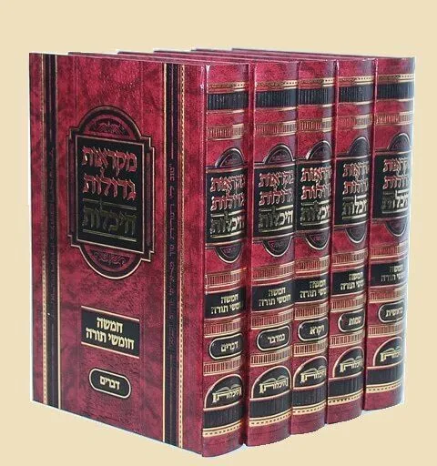 חמישה חומשי תורה מקראות גדולות עם כל המפרשים: אונקלוס, תרגום יונתן בן עוזיאל, תרגום ירושלמי, רש"י, רמב"ן, רשב"ם, ספורנו, אבן עזרא, בעל הטורים, שפתי חכמים, אור החיים, כלי יקר,דעת זקנים מבעלי התוספות, תולדות אהרון, מנחת שי.