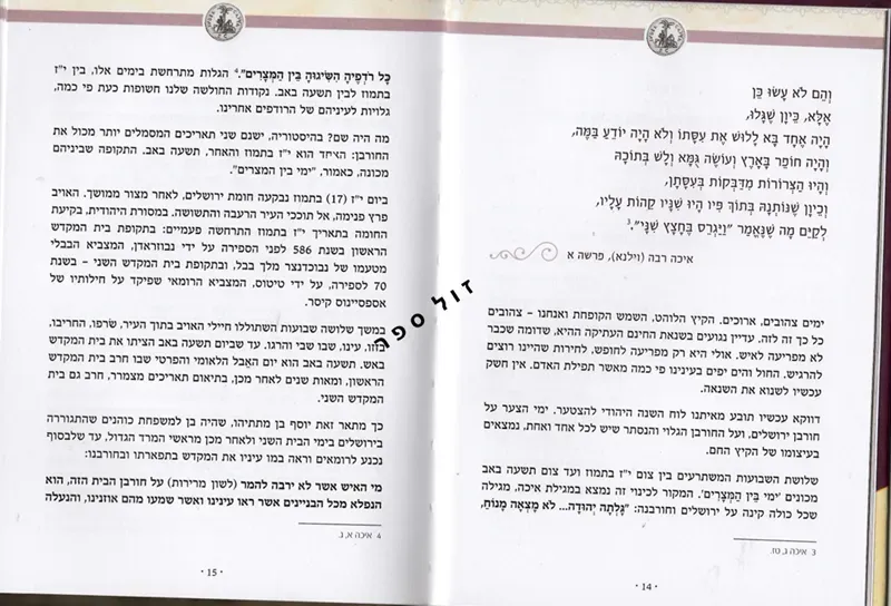 "קוּמִי רֹנִּי בַלַּיְלָ (בַלַּיְלָה) לְרֹאשׁ אַשְׁמֻרוֹת, שִׁפְכִי כַ מַּיִם לִבֵּךְ נֹכַח פְּנֵי ה'... גָדוֹל כַּיָּם שִׁבְרֵךְ, מִי יִרְ פָּא לָךְ" (מתוך מגילת איכה).