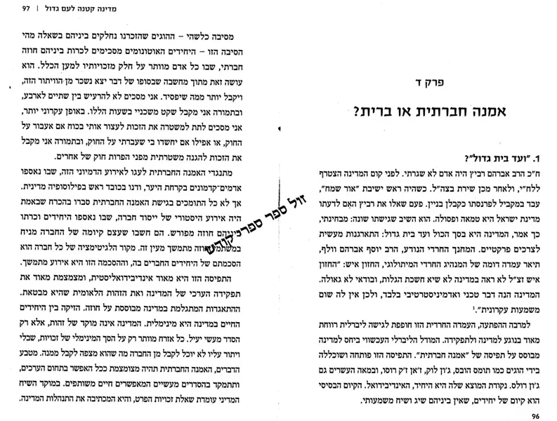 הספקר "מדינה קטנה לעם גדול" מציע גישה מקורית בשיח הישראלי והיהודי. הוא מצדד בחופש חינוכי, לא משום שחופש הוא ערך עליון, אלא משום שחינוך הוא ערך עליון; ותומך ביותר חירות בתחום שירותי הדת, לא רק למען החירות אלא בעיקר למען הדת.