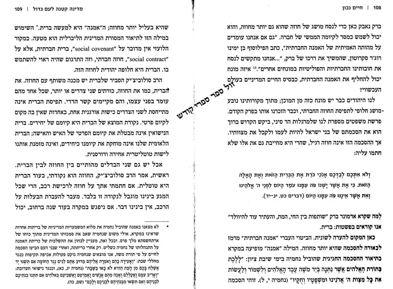 המדינה אינה זהה לעם, טוען הרב נבון; היא כלי בשירות העם. אך המדינה גם אינה רק "אמנה חברתית" בין יחידים מבודדים. מתוך ניתוח מעמיק של מקורות תורניים ועיון בהגות מערבית עכשווית הוא מנסח את מושג הברית כתשתית למדינה יהודית. מדינת הברית צריכה להיות מדינה רזה על מנת להותיר מקום לשגשוגן של יחידות הזהוּת הטבעיות: משפחה, קהילה, עיר ועם. המתכונת הזו היא חלופה לחשיבה הליברטריאנית, המקדשת רק את זכויות היחידים, וגם לחשיבה הפרוגרסיבית, השואפת להשתמש ברשויות ממשלתיות כדי לכפות את ערכיה על החברה כולה.