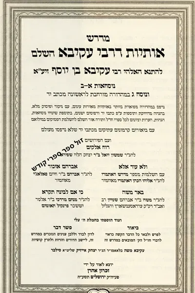 הספר 'מדרש אותיות דרבי עקיבא השלם' הנקרא גם אלפא ביתא דר' עקיבא, להתנא האלוקי רבי עקיבא בהוצאת זכרון אהרון. מהדורה מורחבת בתוספת חלק שלישי מכתב יד שלא נדפס מעולם, מנוקדת, ומלווה בביאורים ופירושים מגדולי רבותינו ופירושים קדמונים לראשונה מכתב יד. ציונים והערות ומבואות על כל מדרש.