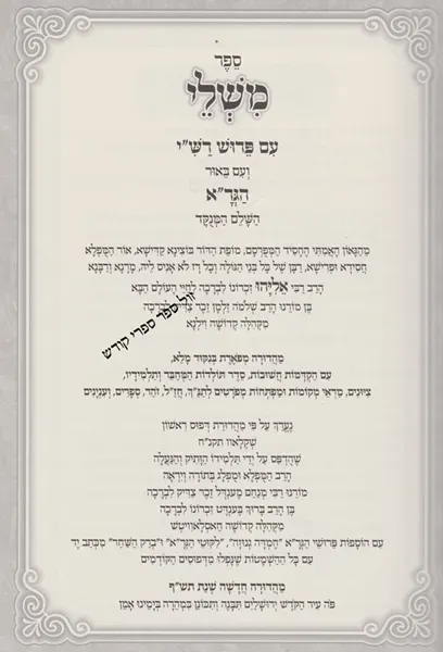 ספר משלי עם פירוש רש"י ועם ביאור הגר"א השלם והמנוקד עם הקדמות חשובות, סדר תולדות המחבר ותלמידיו, ציונים,