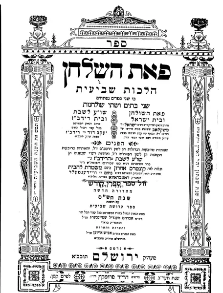 ספר "פאת השולחן" הלכות שביעית ובו שני ספרים - פאת השולחן ובית ישראל לרבי ישראל משלוב ושו"ע לשבת ובית רידב"ז לרבי יעקב דוד רידב"ז, ובתוספת קונטרס אחרון משמרת הבית וספר קדושת שביעית ועוד תוספות חשובות.