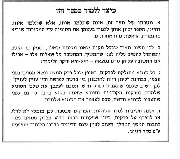 הספר נועד להדריך ללימוד בעיון. לתת ללומד את היסודות שהוא צריך: ידע עיקרי ומסודר בסוגיות הבסיסיות - חזקות, ספיקות, קניינים, תנאי,שליחות וכו'. דרכי הלימוד - איך מוצאים את שורש המחלוקת, את מגדירים במדויק, איך חוזרים בצורה מועילה, איך מסכמים טוב, איך מסדרים סוגיה בשביל ללמדה.