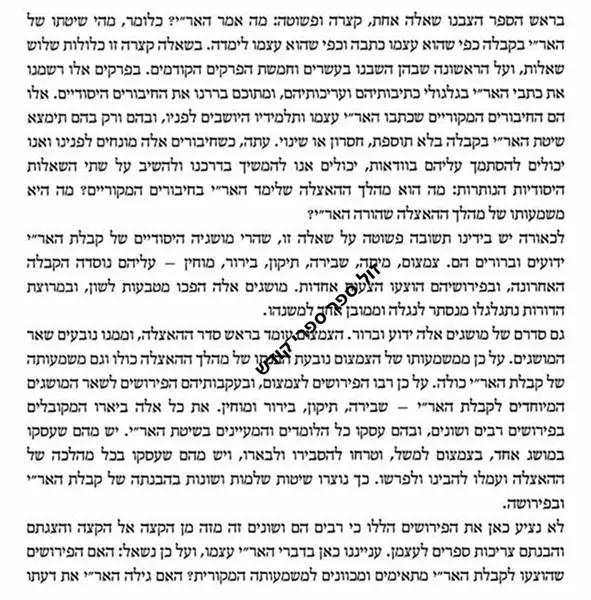 קבלת האר"י תופסת מקום חשוב בתולדות הקבלה. ר' י. לוריא פתח דרך חדשה בפרשנות הזוהר, בתיאור מהלך ההאצלה ובביאור כוונות התפילה. הספר "קבלת האר"י" כולל מחקר שלם ומעמיק המבקש לברר את כתביה ואת תוכנה של קבלת האר"י.