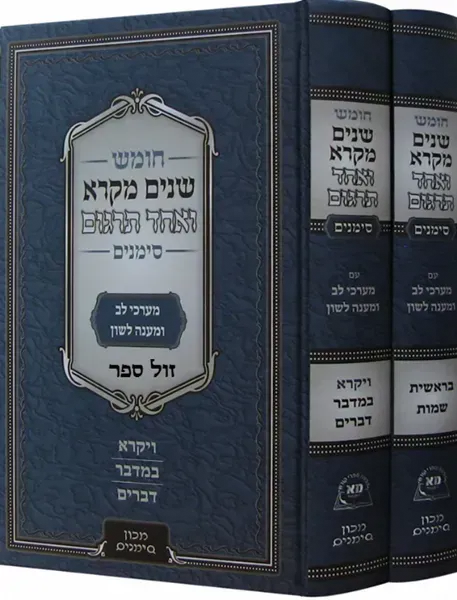 חומש שנים מקרא ואחד תרגום סימנים עם תרגום אונקלוס ופירוש רש"י מנוקד בכתב רש"י ובנוסף שני מדורים חדשים " מערכי לב" - כותרות צד, סיכומיות מול השורה לכל נושאי החומש, ציון תאריכים וכן תוכן מפורט.